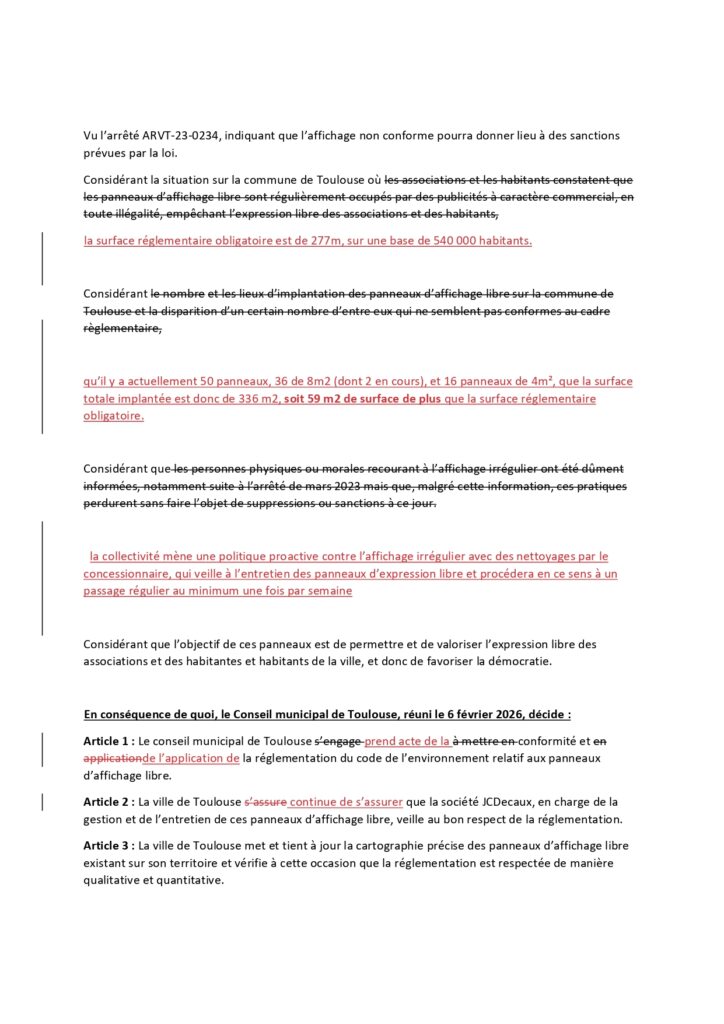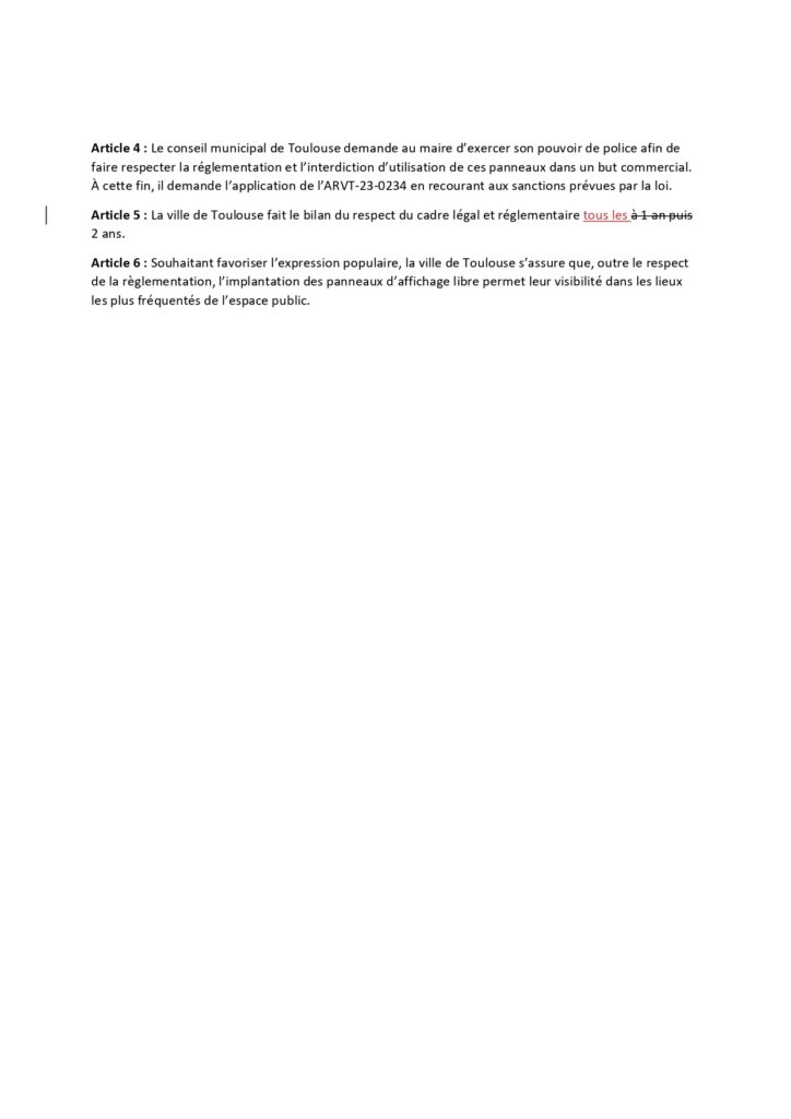 Article 1 : Le conseil municipal de Toulouse s’engage à mettre en conformité et en application la réglementation du code de l’environnement relatif aux panneaux d’affichage libre.